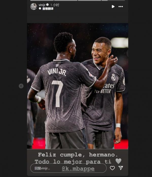 維尼修斯曬出兩人合照,并配文:“生日快樂,兄弟。祝你一切順利@姆巴佩”。